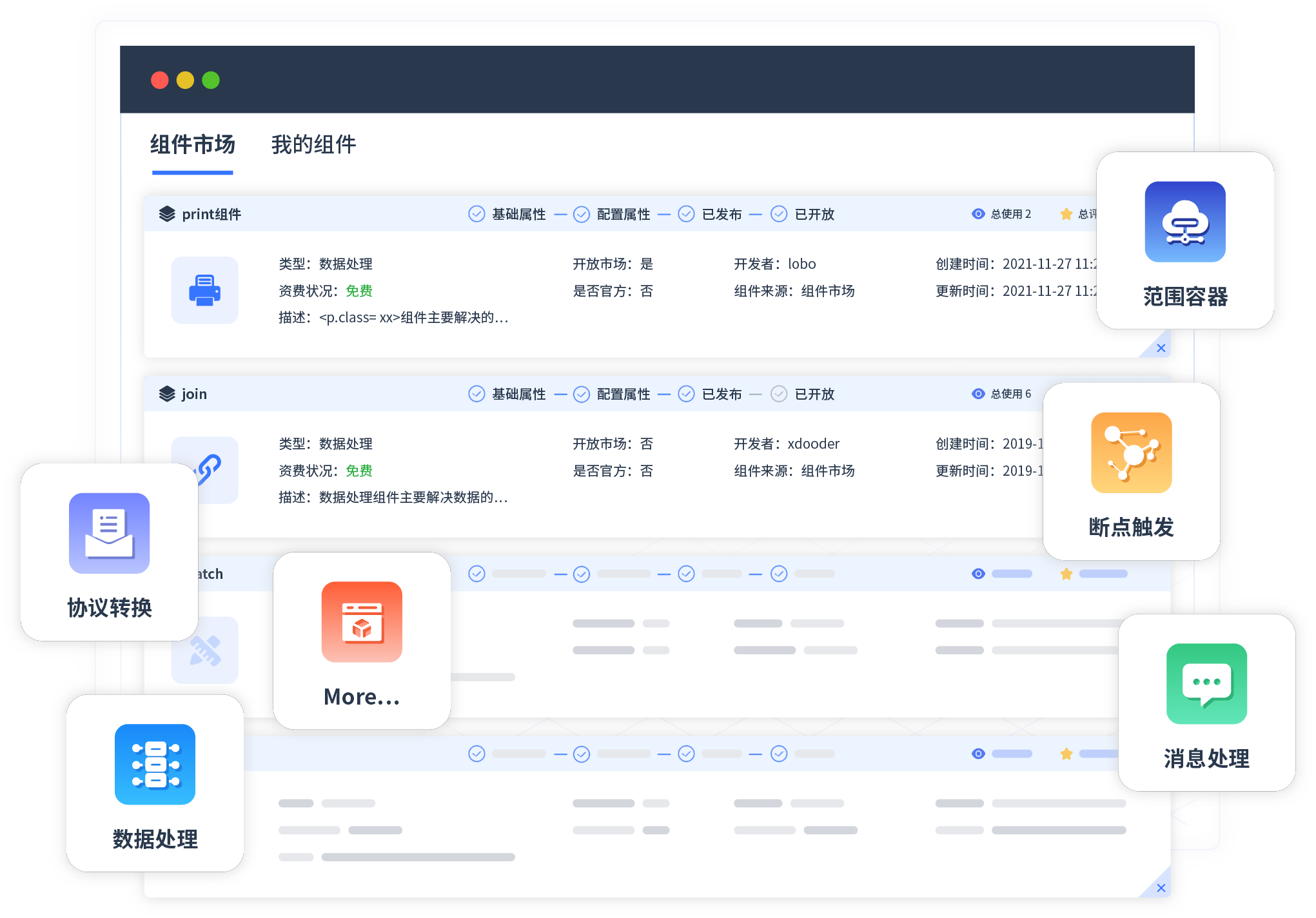 针对集成场景,爱游戏平台提供组件市场,例如协议转换、消息处理、文件操作等。除平台提供的组件外,客户可以自定义所需组件。